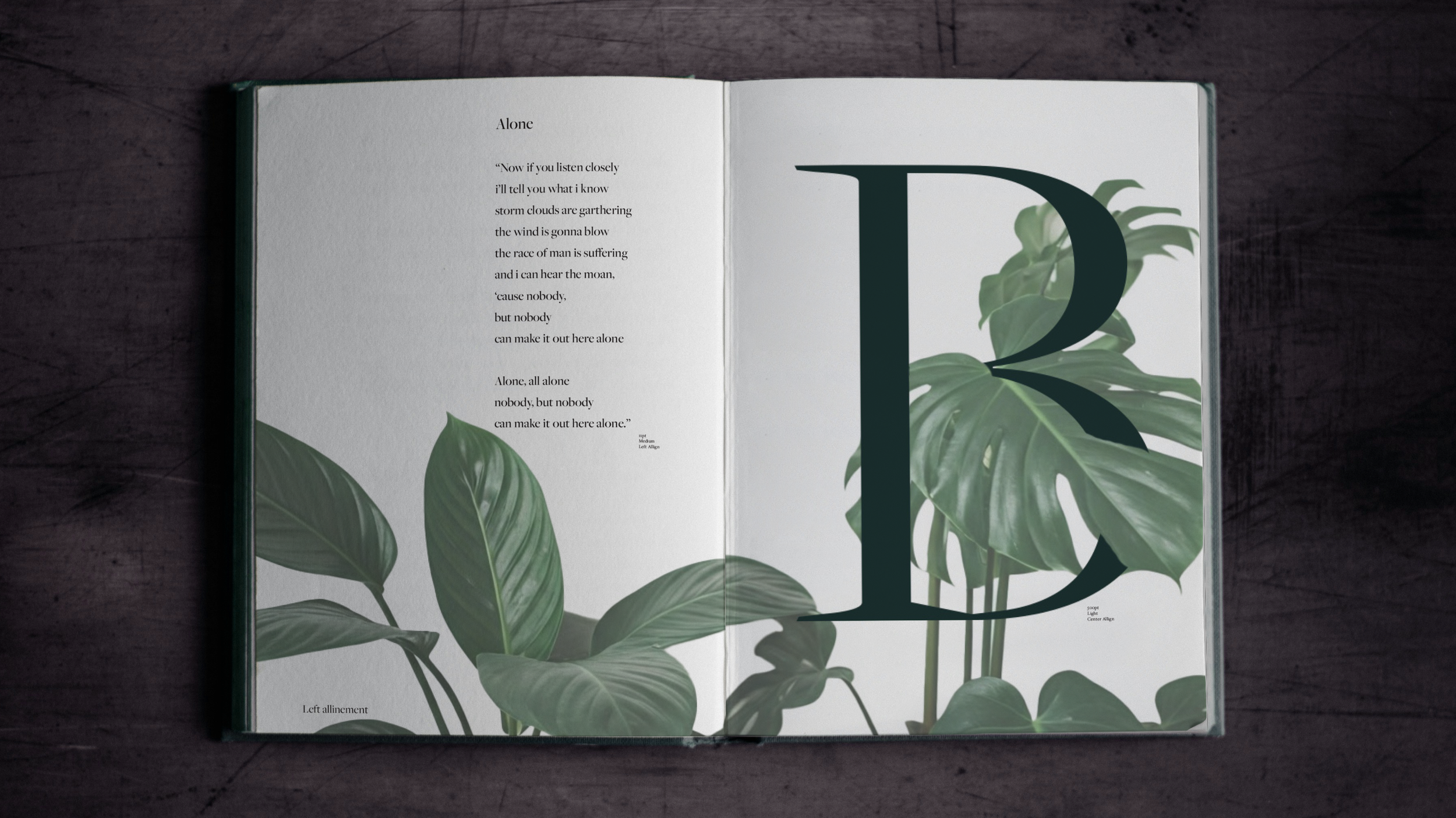 This project explores the Freight typeface through a full, custom-designed specimen book. Each spread studies the type family’s structure, rhythm, and personality, pairing detailed typographic breakdowns with organic plant photography to highlight contrast, elegance, and movement. The book includes alphabet sets, numerals, special characters, and layout demonstrations that show how the typeface performs in real editorial settings. By combining expressive imagery with thoughtful composition, this specimen showcases both the versatility of Freight and my approach to creating refined, publication-style typography.
